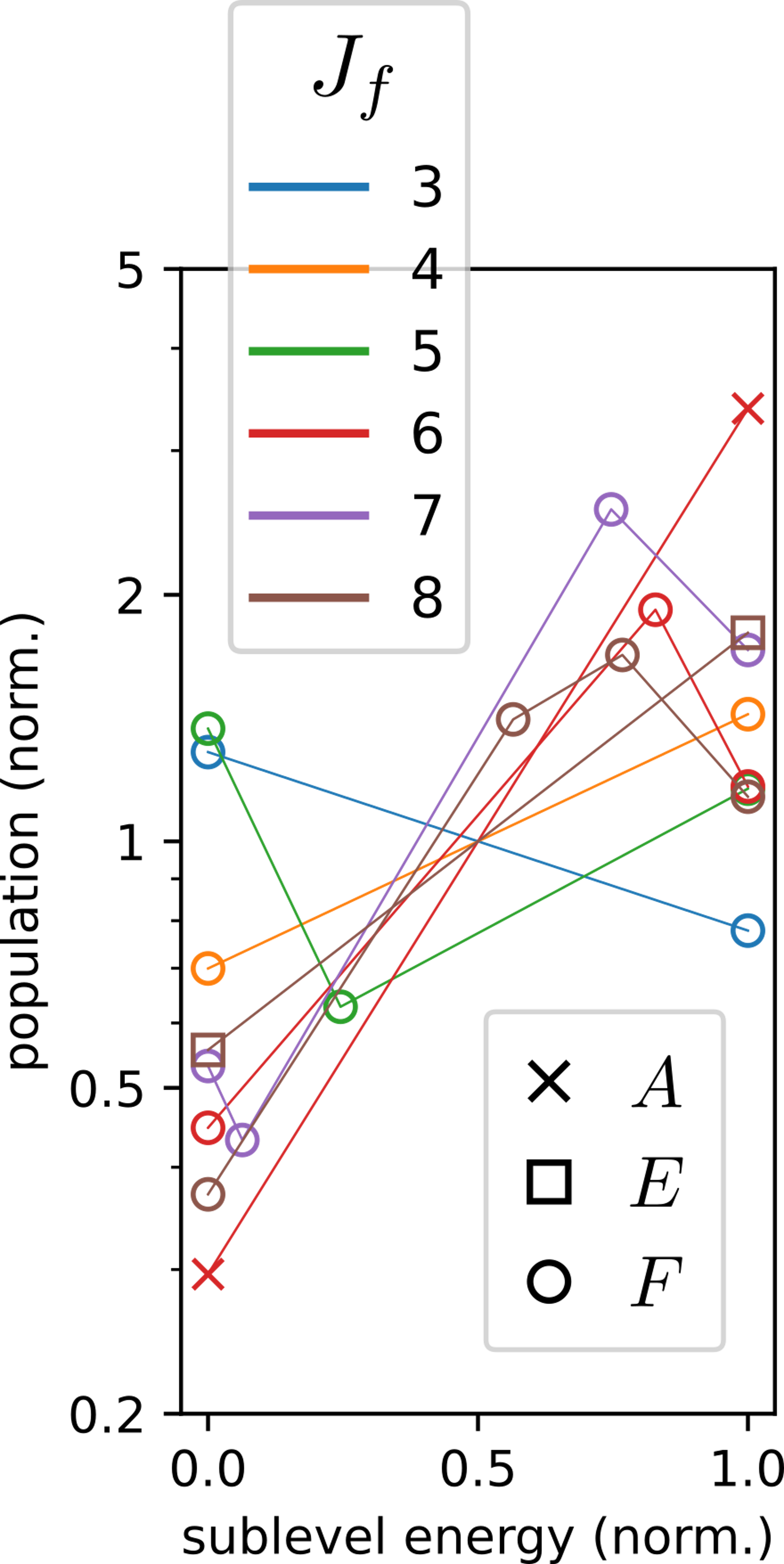 see figure 1 for a graphical summary of the experimental results for methane (CH4) molecules scattering from a gold surface. plotted on the y axis are the level populations. we group levels by connecting them by lines, and levels within a group simultaneously: