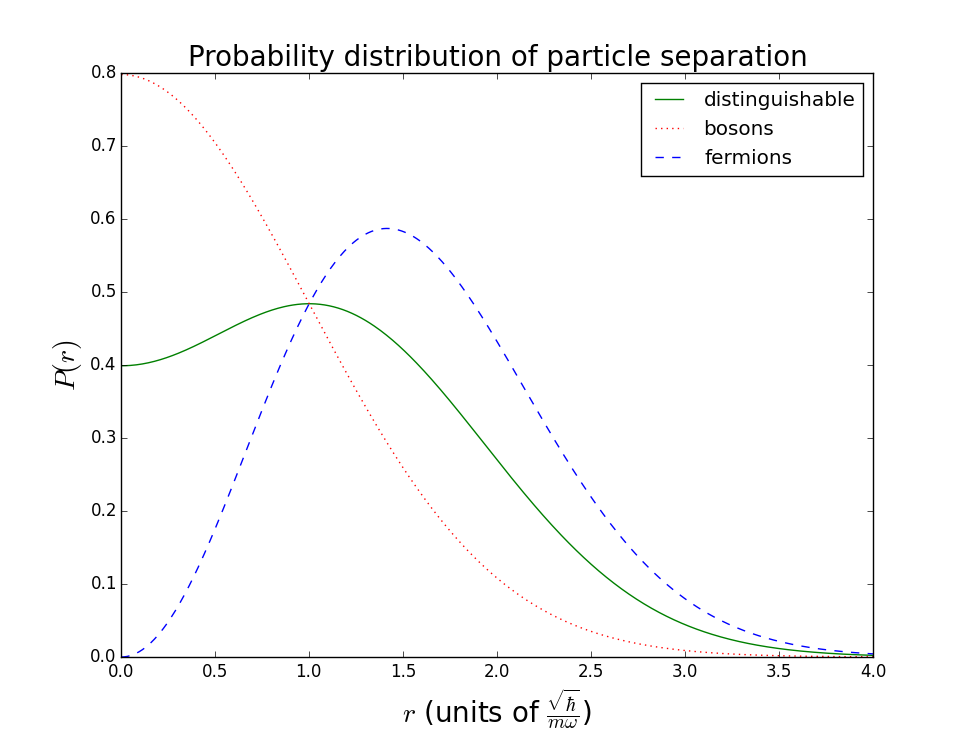 For the bosonic / fermionic cases, we note that P(r) is the same for $\psi_1(x_1)\psi_0(x_2)$, so we only need to look at the cross term: